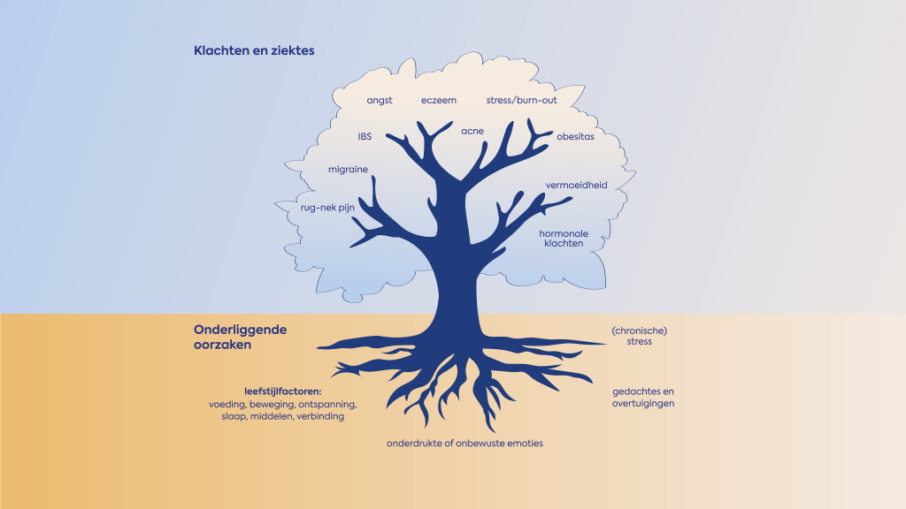 Leefstijl is een van de sleutelwoorden die een verschil kan maken. Lian maakt de vergelijking met een boom. “De takken, bladeren en stam van de boom staan symbool voor de klachten of aandoeningen. De medische wereld is biomedisch opgeleid en richt zich vaak nog op het bestrijden van symptomen. Terwijl de grondoorzaak eigenlijk zit in hoe gezond je bodem is. Als je niet investeert in een vruchtbare bodem, blijf je onkruid bestrijden. De echte oorzaak ligt dieper. De gezondheid van onze bodem wordt beïnvloed door onze keuzes in leefstijl zoals voeding, slaap, beweging en ontspanning. En nog dieper, door onze gevoelens, gedachten en overtuigingen. Deze kunnen ons autonome zenuwstelsel ontregelen dat continu alles aanstuurt. Wat ongezondheid doet, is een disbalans creëren in je immuunsysteem, stress en hormonale systeem. En die drie systemen hebben invloed op ons.” Volgens Lian moeten we daarom anders gaan kijken. “We zullen onze blik die nu gericht is op symptoombestrijding, ook moeten richten op de oorzaak. Zodat de boom gezonder wordt. Zo creëren we een win-win situatie.”